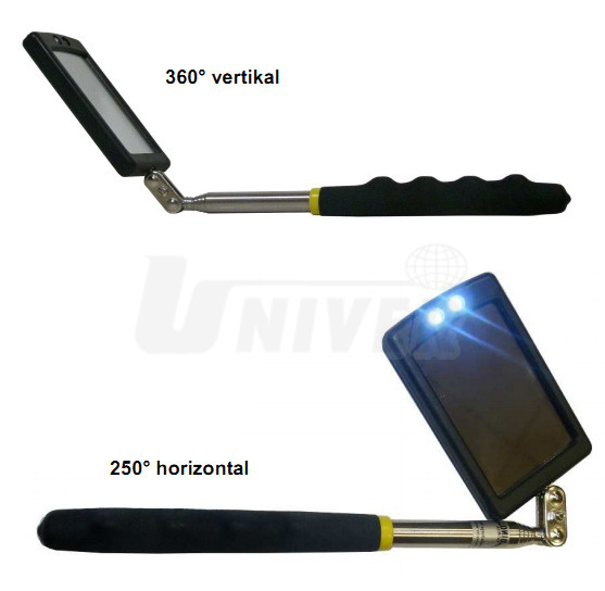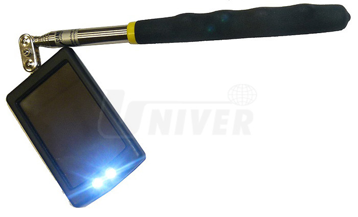 Speciální zrcátko s LED osvětlením pro ohledávání obtížně přístupných míst, například místa poškození nebo koroze karosérií, spodní části karosérií, ale také na stavbách, v průmyslu, v domácnostech apod. Má dlouhé výsuvné/teleskopické držadlo, na kterém je speciální kloub dovolující natáčení zrcátka (o 360° vertikálně a o 250° horizontálně). LED-osvětlení umožňuje sledovat zejména prostory, kde je nedostatek denního světla. Výsuvné držadlo usnadňuje kontroly, aniž by se pozorovatel musel nepřirozeně či namáhavě shýbat.Parametry: