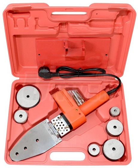 Svářečka plastových trubek 800 W s automatickým termoregulátorem, 6 nástavců Ø 20/25/32/40/50/63 mm, stojan a příslušenství.- pro polyfúzní svařování všech termoplastických materiálů, zejména spojování plastových trubek (nejčastěji z PP, PE, PB, PPC, PPR nebo PVDF) pomocí tvarovek v rámci instalačních prací, především vnitřních rozvodů vody a topení
